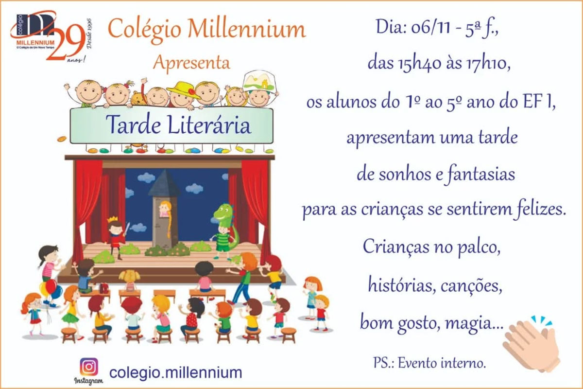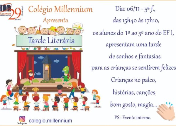 Dia: 06/11 – 5ª f., das 15h40 às 17h10, os alunos do 1° ao 5° ano do EFI, apresentam uma tarde de sonhos e fantasias para as crianças se sentirem felizes.